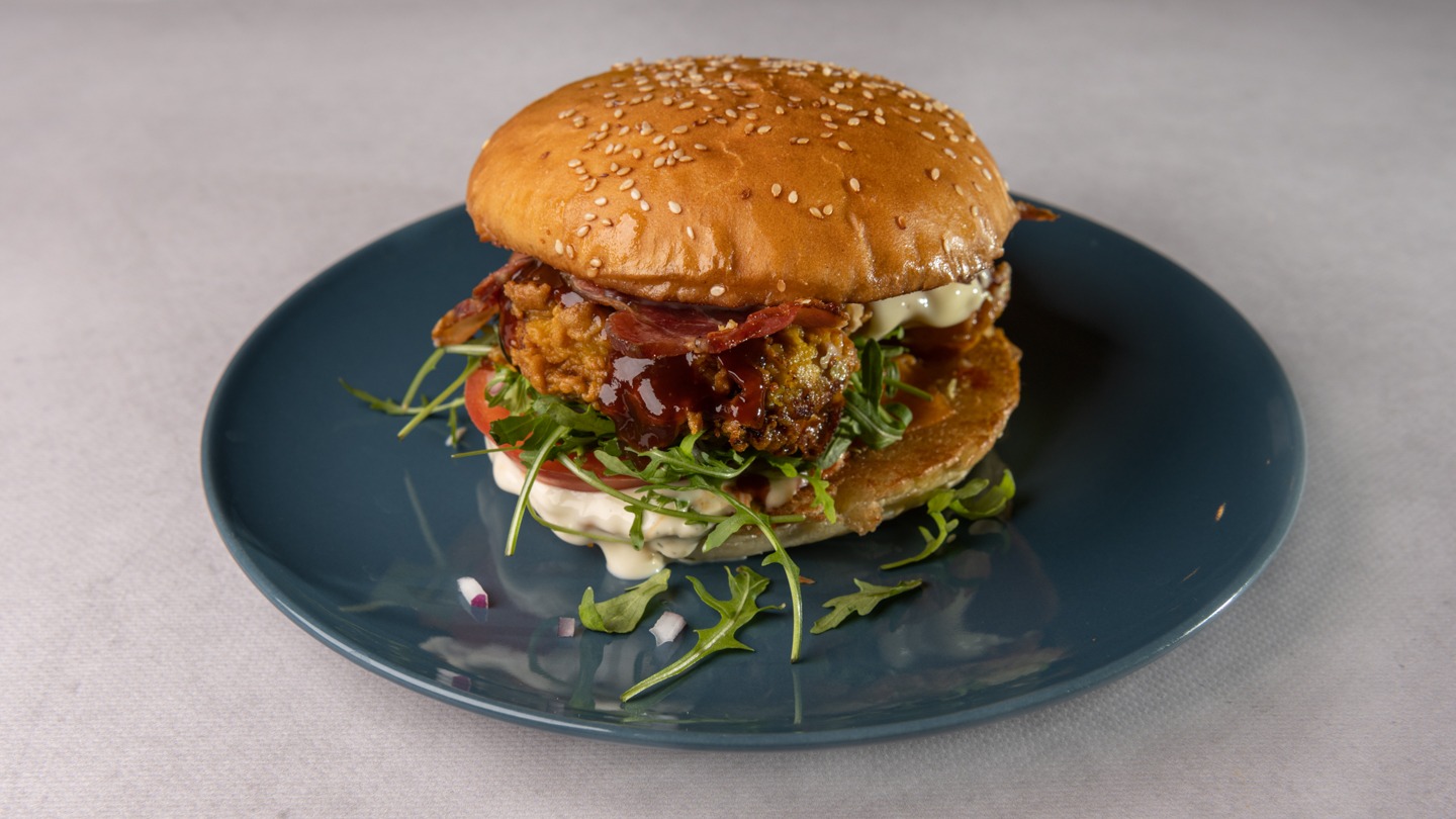 Nasz gofr nadziewany serem, chrupiący kurczak w glazurze Buffalo, konfitura z cebuli, rukola, sos Blue Cheese Opakowanie -
