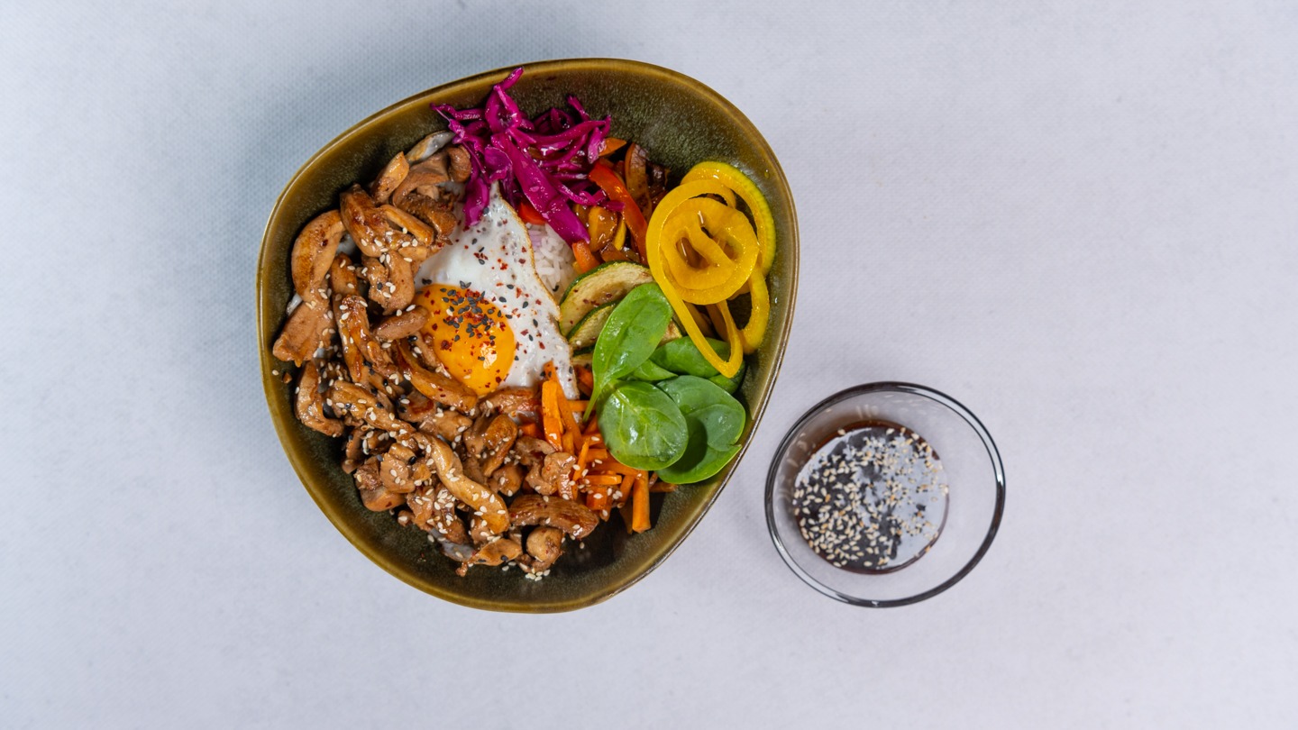 Nasz gofr, chrupiący kurczak w glazurze Teriyaki, Wakame, marynowane jajo, sezam, majonez Opakowanie
